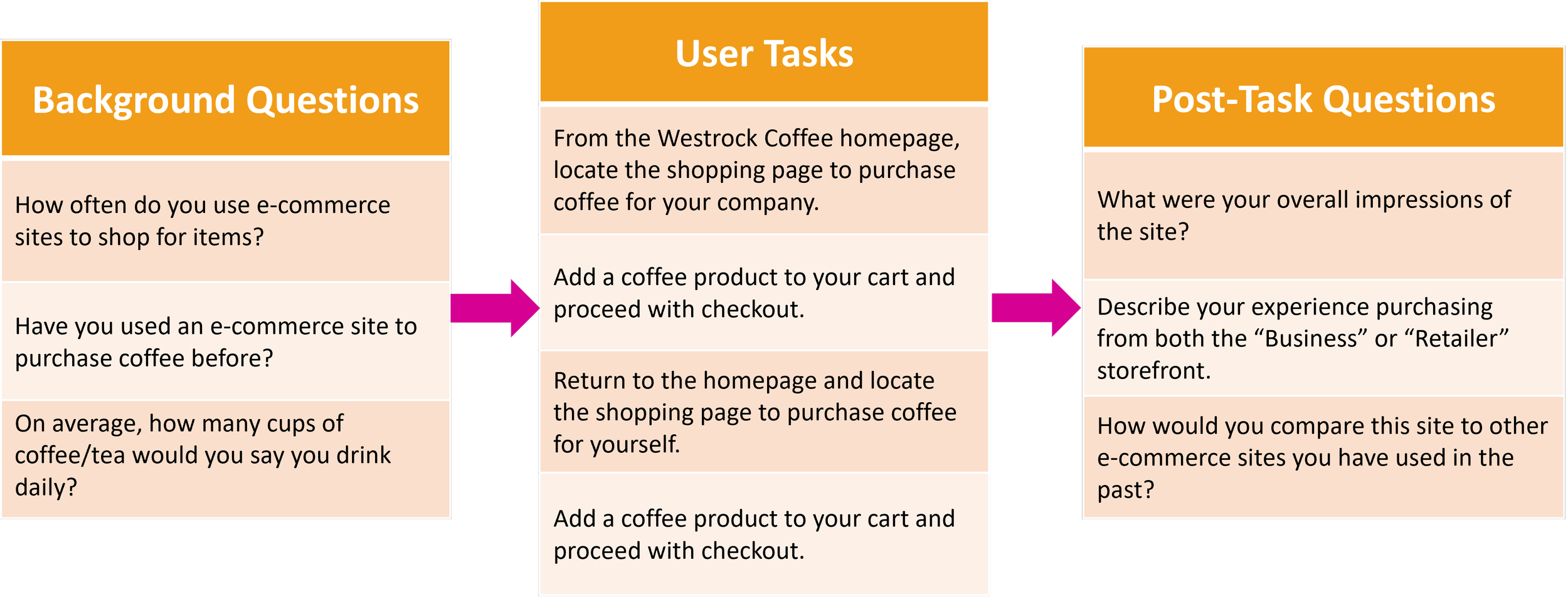 The three users were first asked a few evaluation questions to understand their previous experiences using e-commerce websites. They were then tasked to navigate to Westrock Coffee’s homepage and look through the site. Once they have finished looking, they were all asked to try and purchase coffee from both the business and retailer storefronts. The users were instructed to Think Aloud while working through these tasks while sharing their screen. After completing these tasks, the users were presented with a few post-task questions to express their overall experience using the site. The feedback was then categorized and used to justify the three problems in this case study.