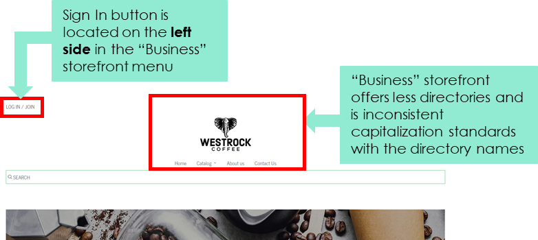 Pictured above: Showcasing the differences in the navigation bars in the “Shop for Business” page (top, green boxes) and the homepage (bottom, orange boxes)