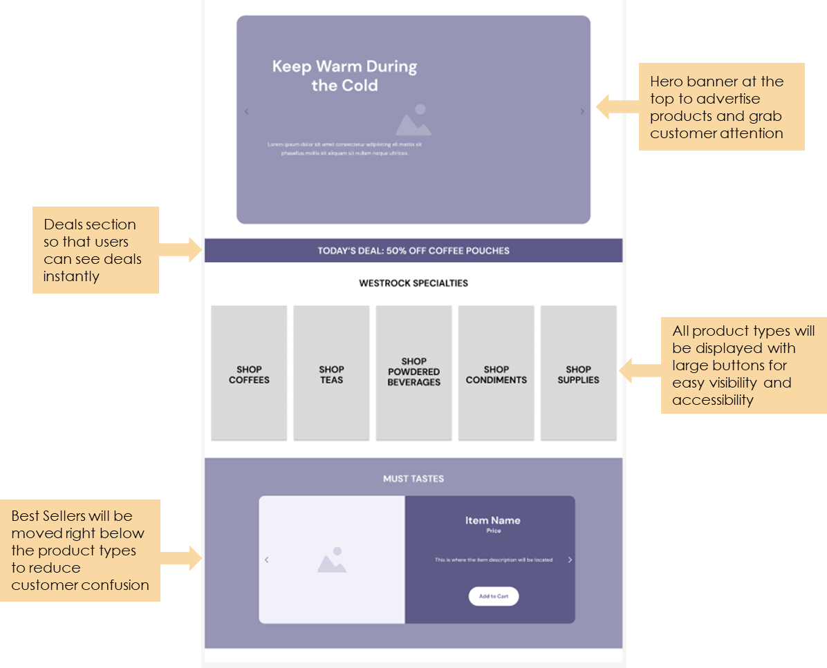 The content hierarchy of the “Shop for Business” webpage will be redesigned so that the actual products being sold are at the forefront of the page by repositioning certain sections and removing extraneous content. A visual hierarchy will also be established so that the best selling categories will have larger buttons for better user accessibility. Lastly, the stock photo-like images will be replaced with high-quality, web-optimized photos that showcase Westrock Coffee Company’s products in their truest form.