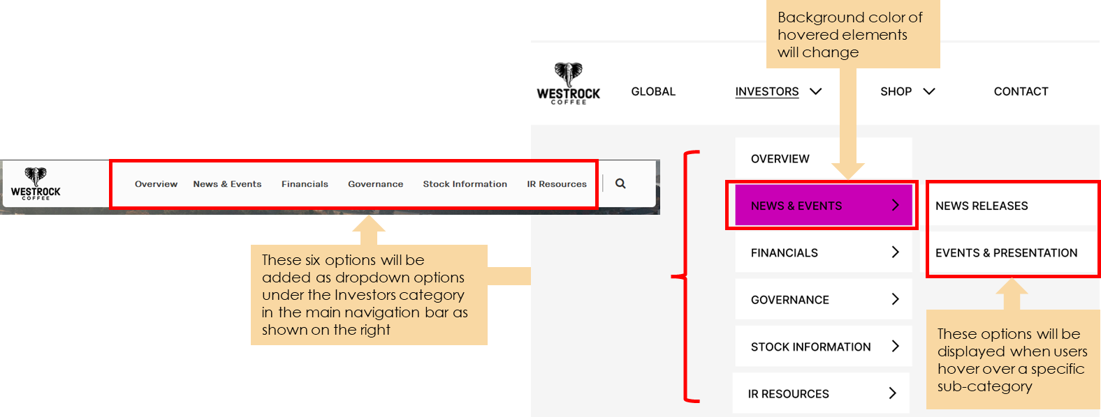 The navigation bar that is currently utilized in the “Investors” and “Shop for Business” pages will be replaced with the navigation that is used throughout most of the site. A cascading dropdown menu will also be added to incorporate the menu options from the removed navigation menu. Users will also be redirected to one add to cart page regardless of whether they are shopping for a business or themselves.