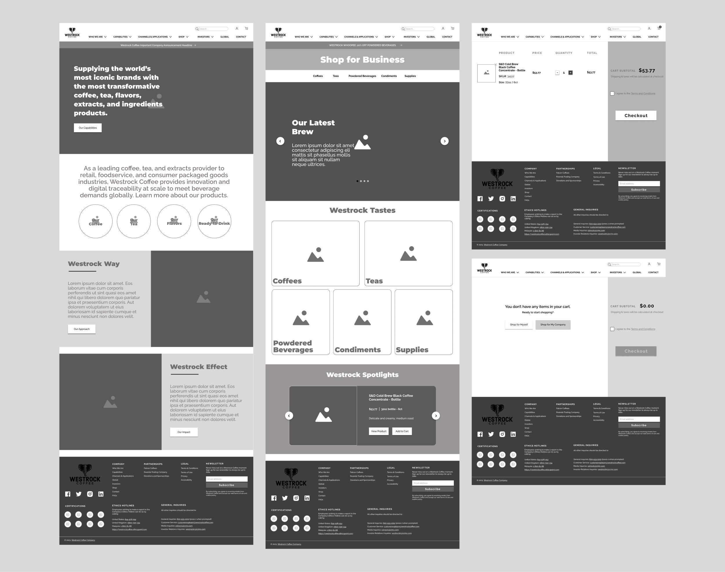 Pictured above: Final mockup of the Westrock Coffee Company redesign of the homepage (left), Shop for Business page (right), and the cart page with item (right, top) or no item (right, bottom)